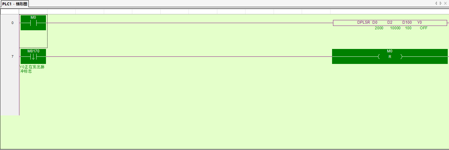 指令的使能位 M0接通后 PLSR/DPLSR指令開(kāi)始執(zhí)行 以D0數(shù)據(jù)大小的頻率 輸出D2個(gè)脈沖數(shù)量 脈沖頻率達(dá)到最大的加速時(shí)間是D100 脈沖通過(guò)端口Y0輸出