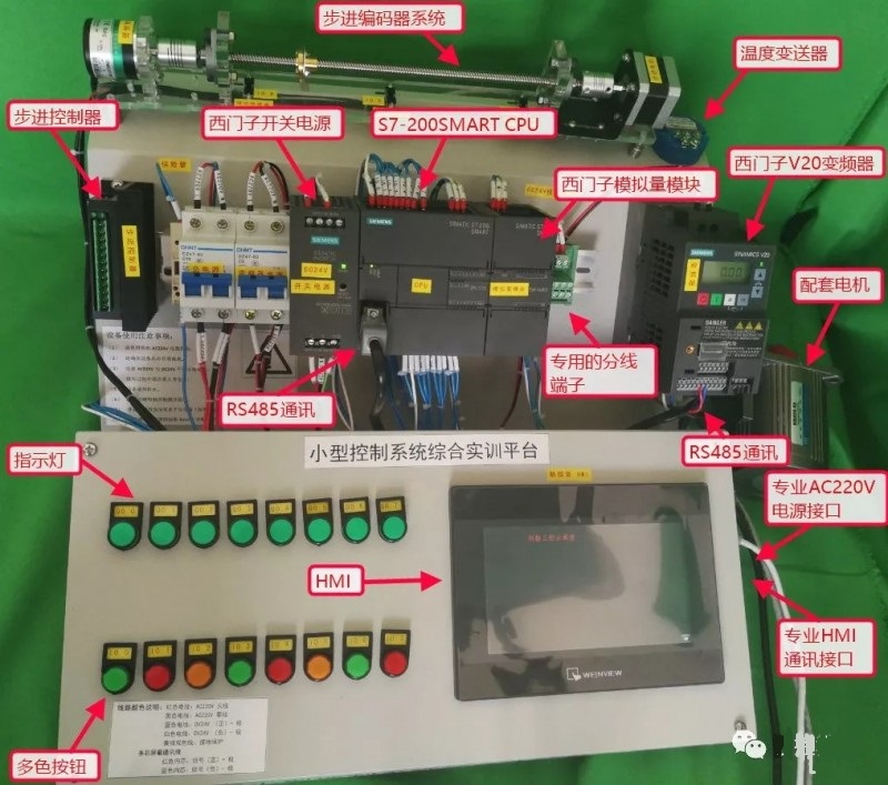 實訓設備: 家實訓練習需要配套的實訓設備,專門制作了部分實訓設備(每套設 備配備200SMART PLC、模擬量模塊、變頻器、電機、步進、滑臺、觸摸屏、按鈕/指示燈等),